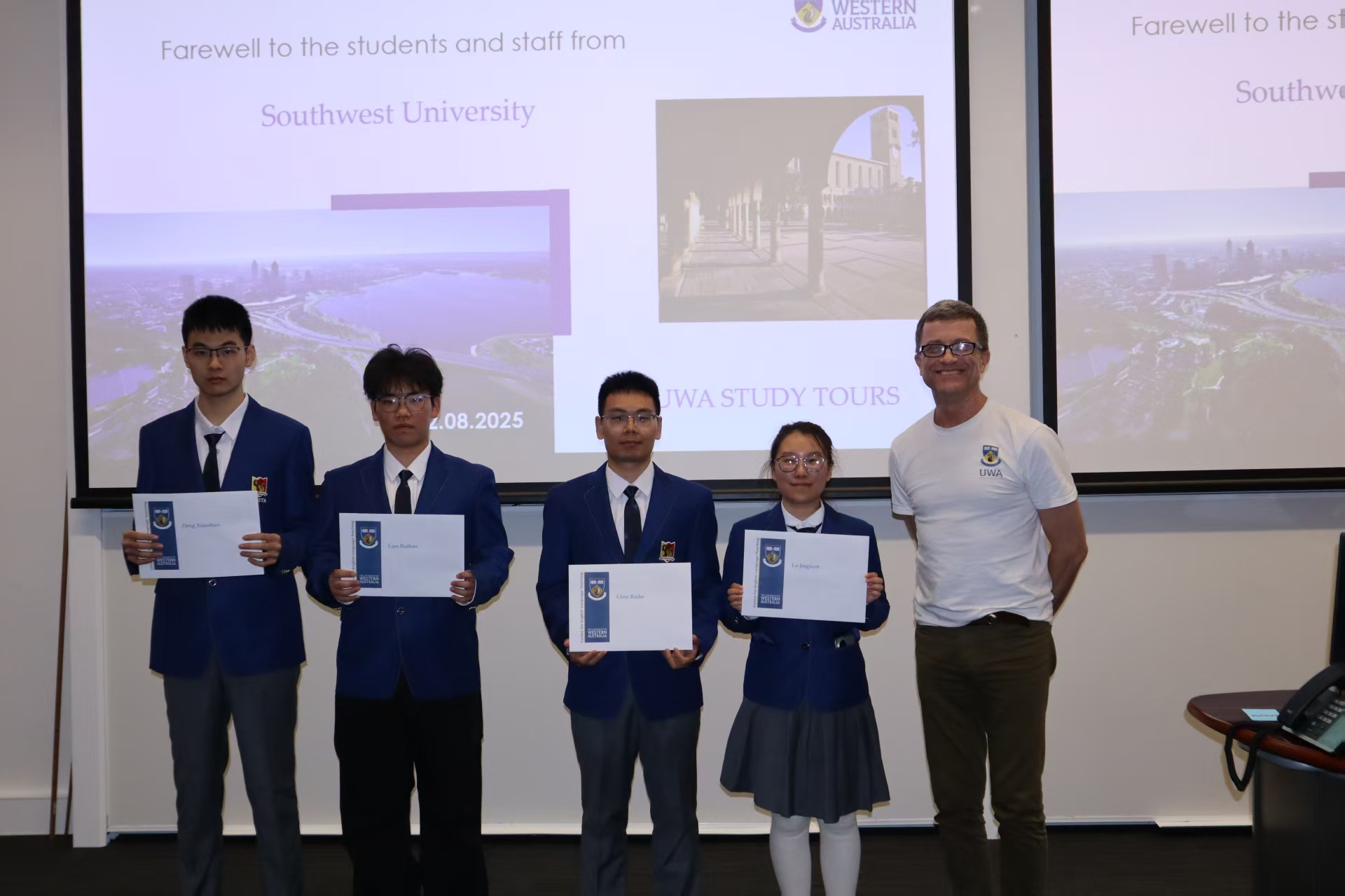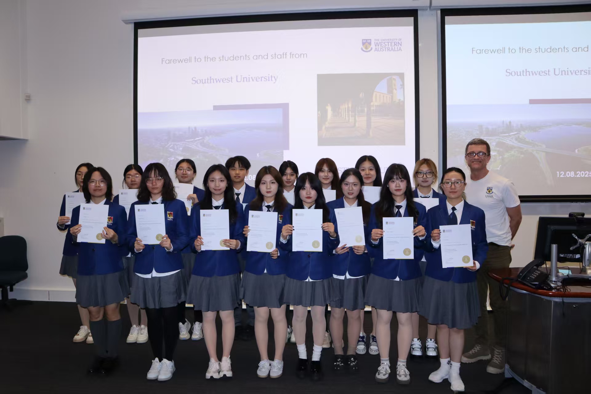 随后,电子信息工程专业学生代表廖睿涵与经济学专业学生代表施展上台分享,他们热情讲述了在西澳大学的学习探索与自我突破的经历。最后,同学们依次上台领取结业证书,并合影留念。