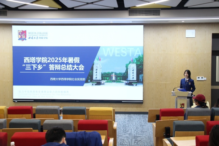 校团委社会实践部部长邱雪就学校2025年暑期"三下乡"社会实践活动开展情况进行简要介绍,充分肯定了利来国际 暑期"三下乡"活动所取得的成绩,并宣布大会正式开始。